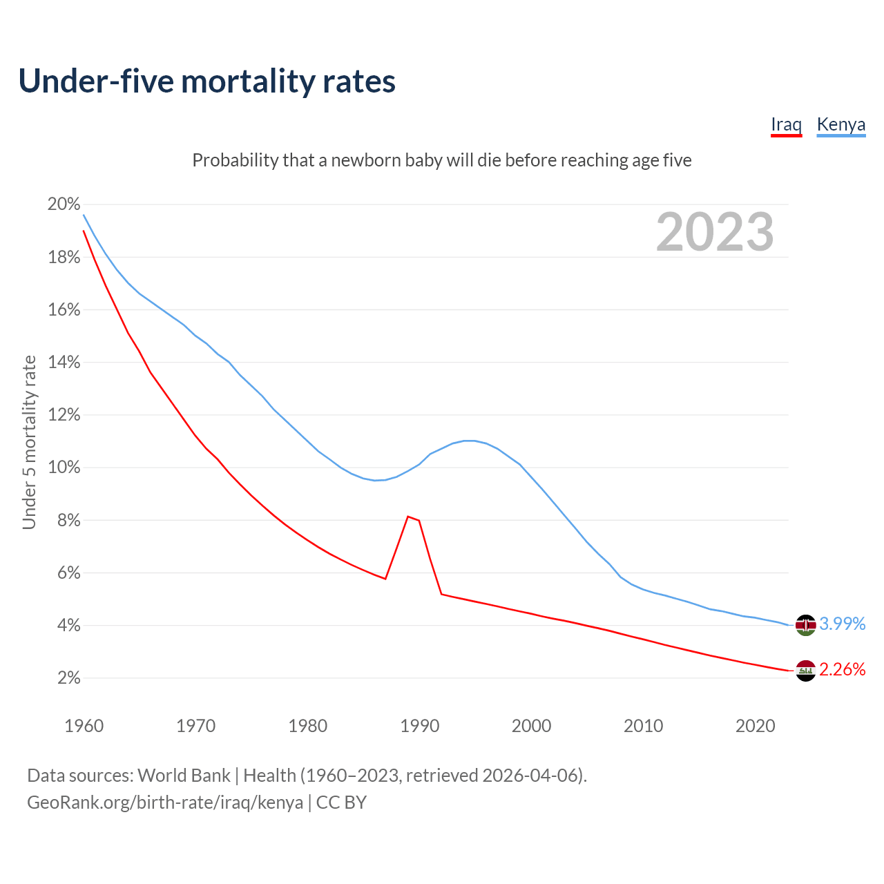 The chance that a newborn baby will die before reaching age five is 2.26% in Iraq and 3.99% in Kenya. Above is a chart with historical data on under-five mortality rates.