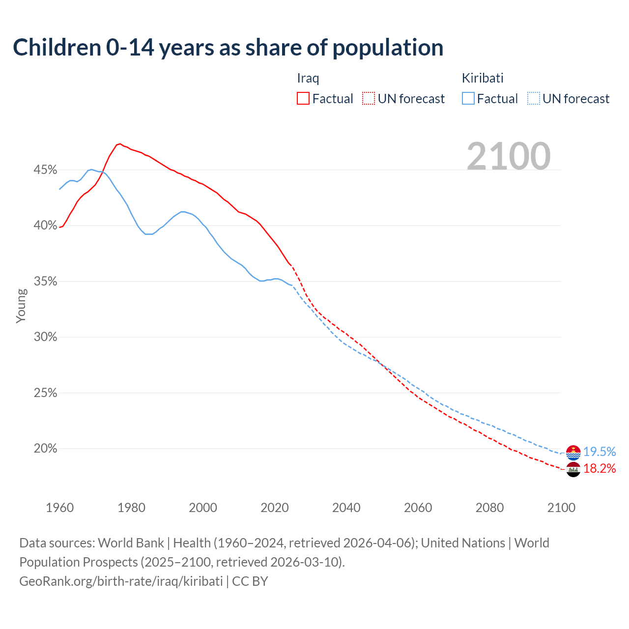 Iraq has an annual birth rate of 25.7 births per 1,000 people, compared to 25.8 for Kiribati. The average number of children a woman is expected to have during her lifetime — the fertility rate, is 3.25 in Iraq and 3.15 in Kiribati — 3.14% difference.