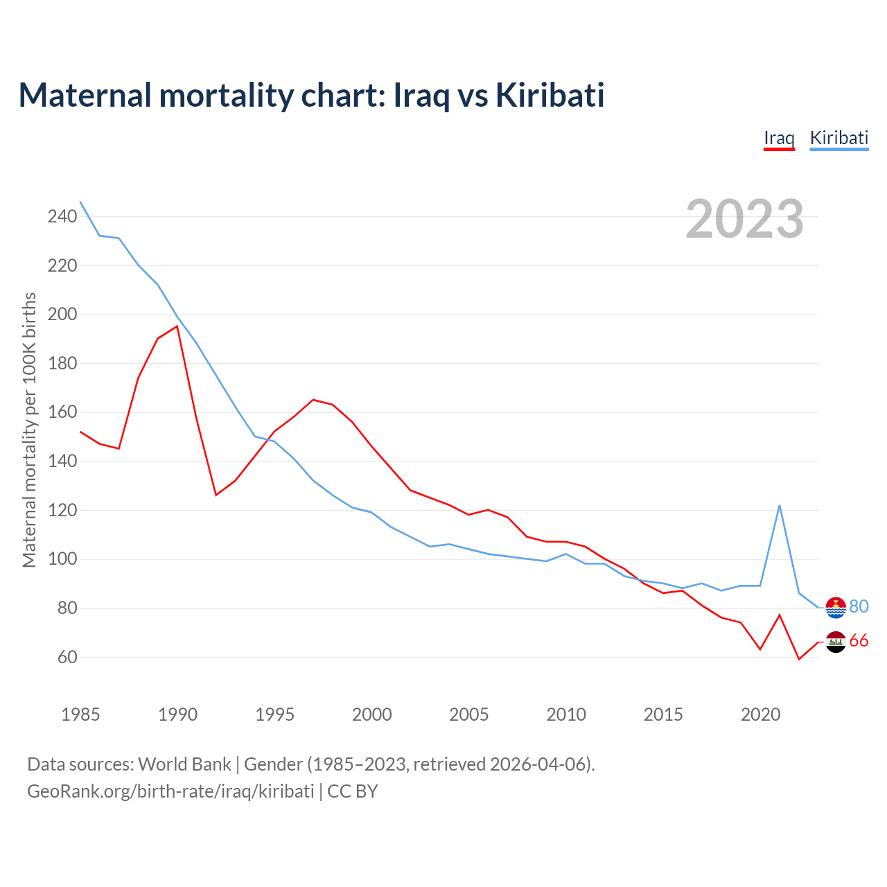 The maternal mortality rate, which is the probability of dying during childbirth or within 42 days of pregnancy termination, is 66 deaths per 100,000 live births in Iraq, compared to 80 deaths in Kiribati.