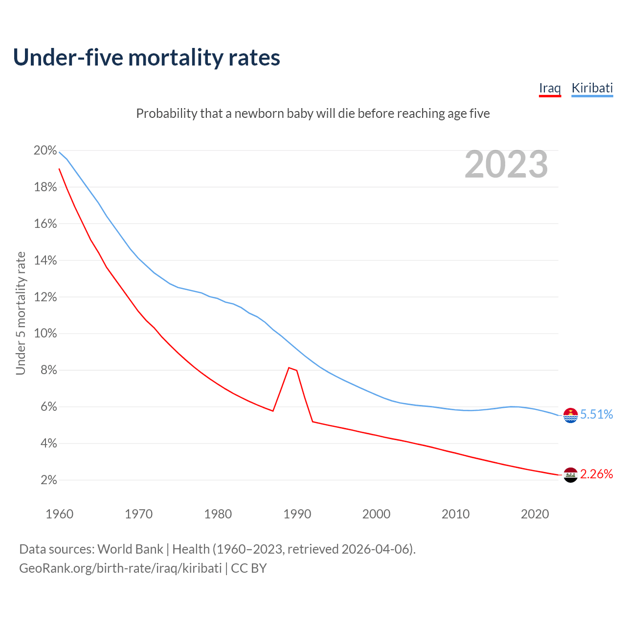 The chance that a newborn baby will die before reaching age five is 2.26% in Iraq and 5.51% in Kiribati. Above is a chart with historical data on under-five mortality rates.