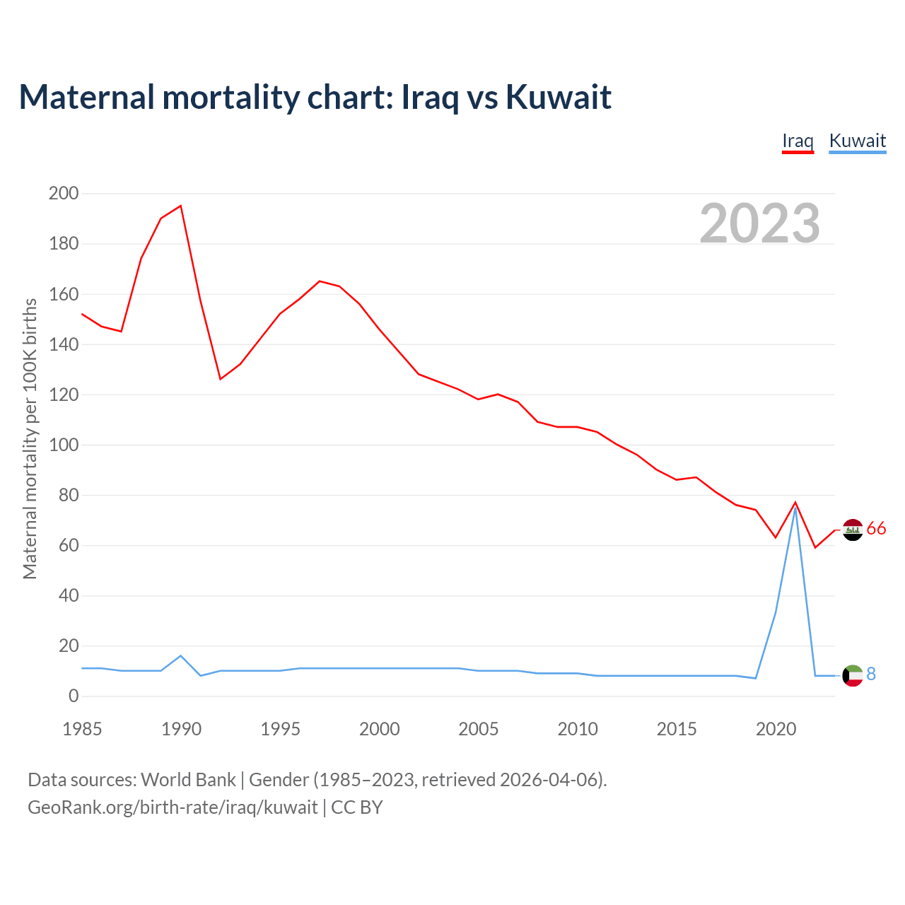 The maternal mortality rate, which is the probability of dying during childbirth or within 42 days of pregnancy termination, is 66 deaths per 100,000 live births in Iraq, compared to 8 deaths in Kuwait.