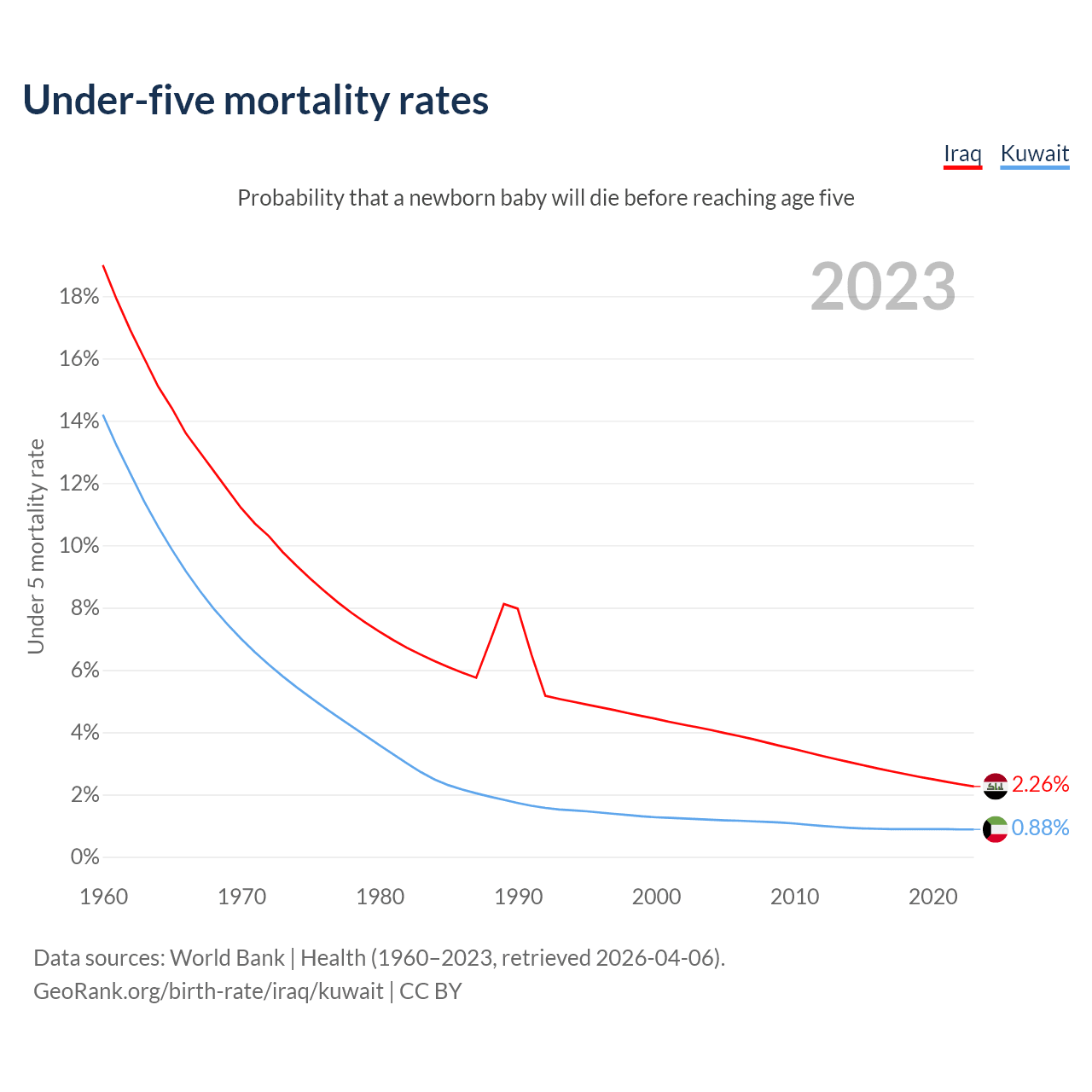The chance that a newborn baby will die before reaching age five is 2.26% in Iraq and 0.88% in Kuwait. Above is a chart with historical data on under-five mortality rates.