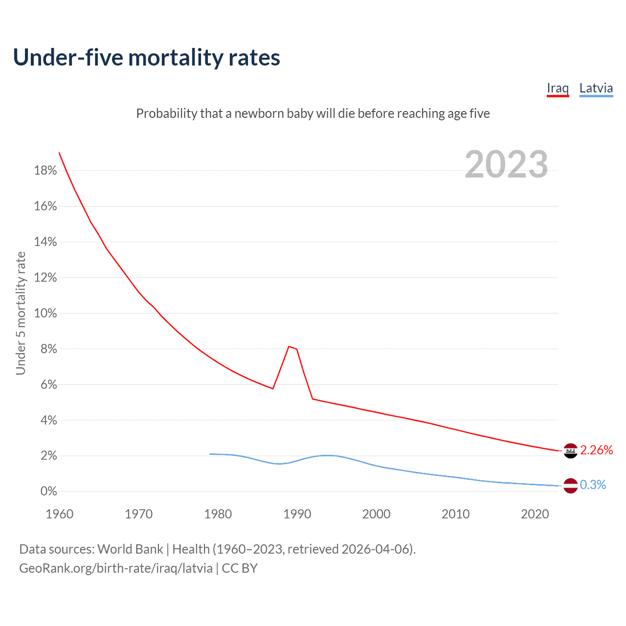 The chance that a newborn baby will die before reaching age five is 2.26% in Iraq and 0.3% in Latvia. Above is a chart with historical data on under-five mortality rates.
