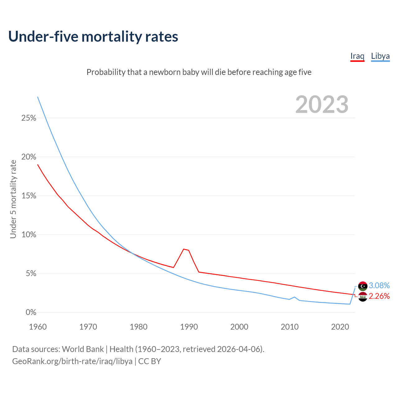 The chance that a newborn baby will die before reaching age five is 2.26% in Iraq and 3.08% in Libya. Above is a chart with historical data on under-five mortality rates.