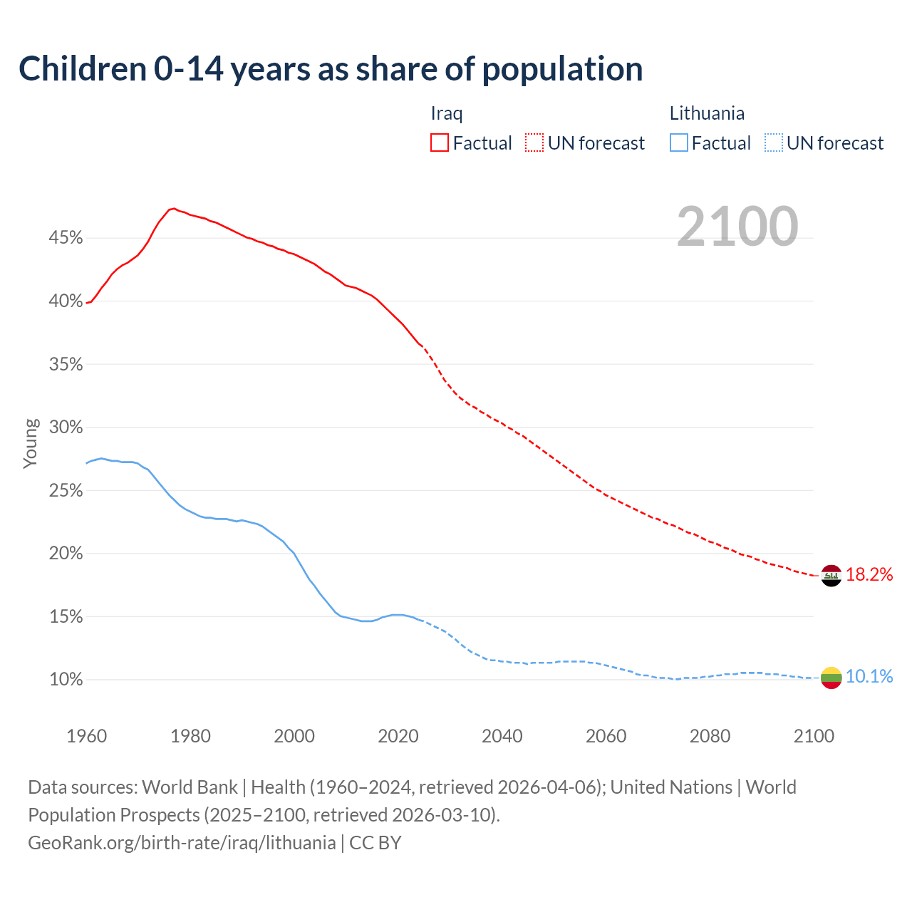 Iraq has an annual birth rate of 25.7 births per 1,000 people, compared to 7.2 for Lithuania. The average number of children a woman is expected to have during her lifetime — the fertility rate, is 3.25 in Iraq and 1.18 in Lithuania — 63.7% difference.