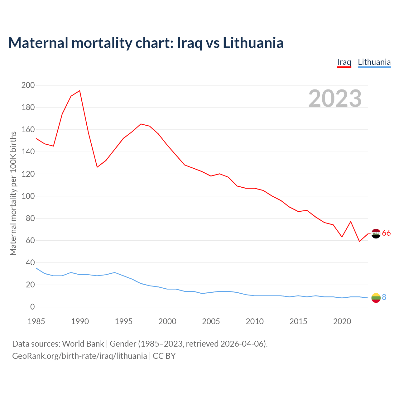 The maternal mortality rate, which is the probability of dying during childbirth or within 42 days of pregnancy termination, is 66 deaths per 100,000 live births in Iraq, compared to 8 deaths in Lithuania.