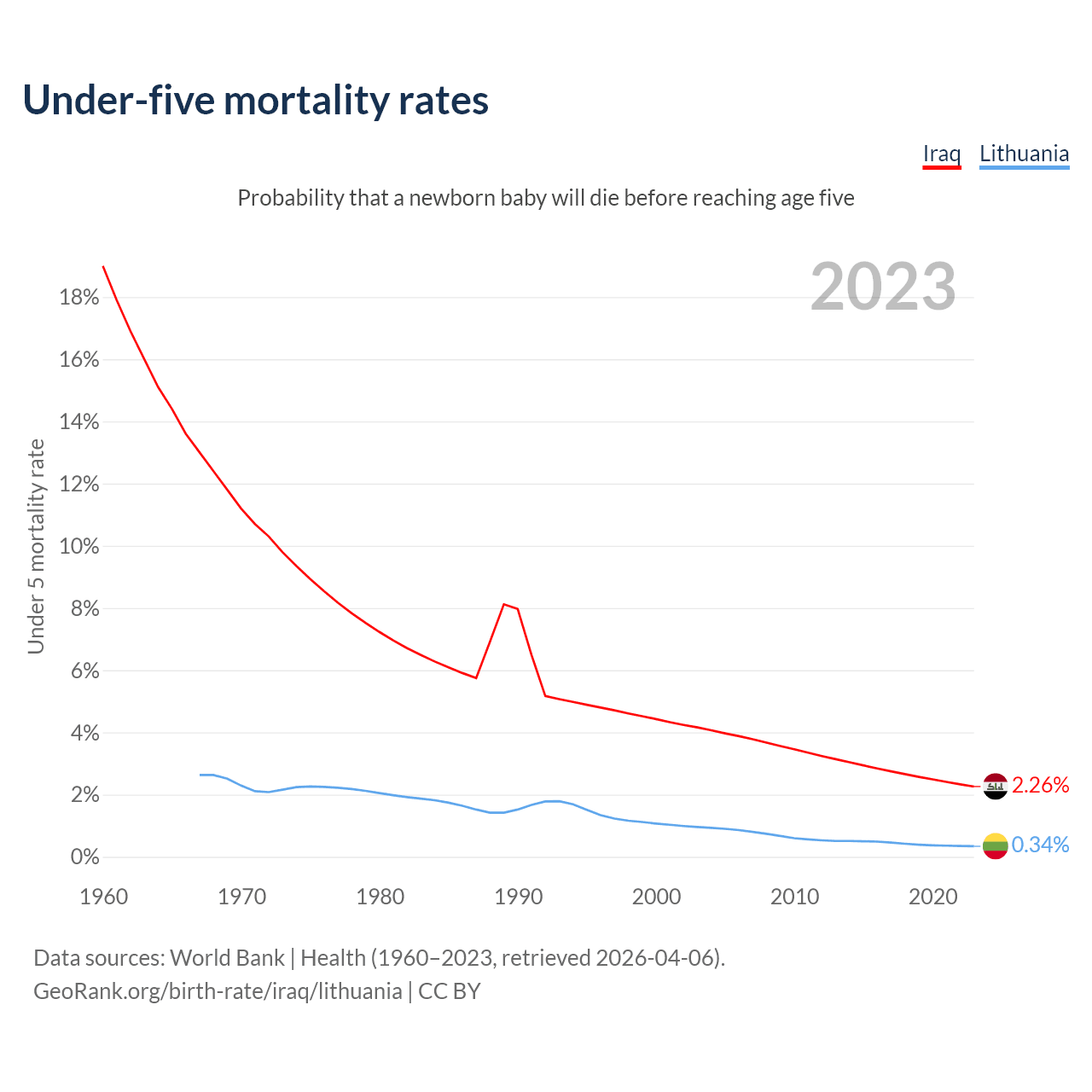 The chance that a newborn baby will die before reaching age five is 2.26% in Iraq and 0.34% in Lithuania. Above is a chart with historical data on under-five mortality rates.