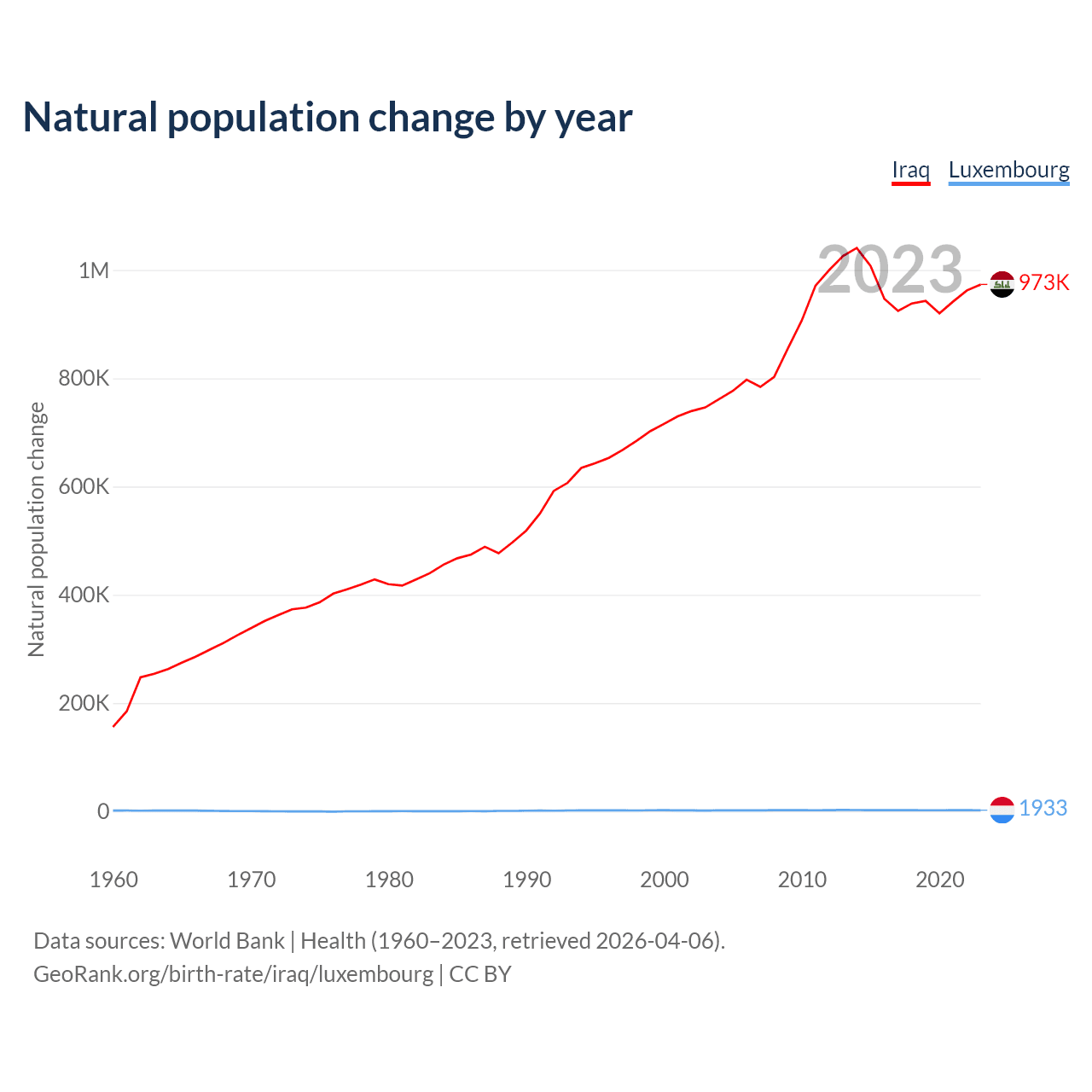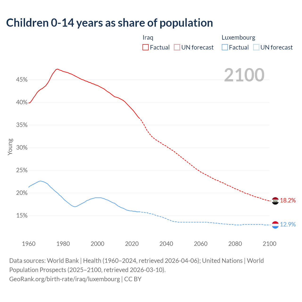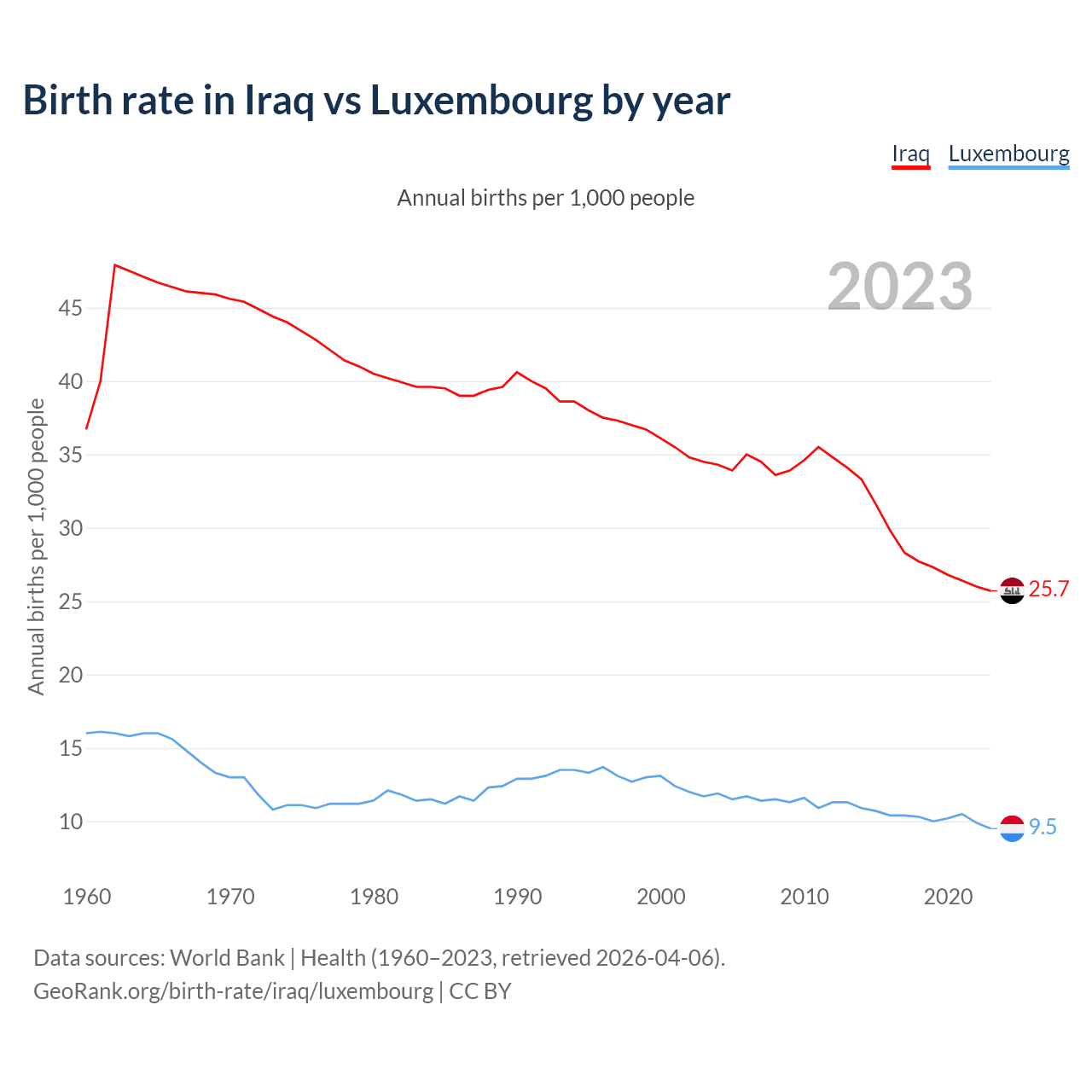 Iraq has an annual birth rate of 25.7 births per 1,000 people, compared to 9.5 for Luxembourg. The average number of children a woman is expected to have during her lifetime — the fertility rate, is 3.25 in Iraq and 1.25 in Luxembourg — 61.5% difference.