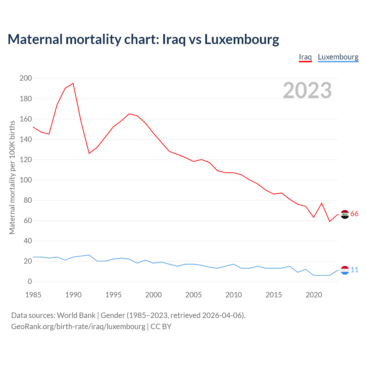 The maternal mortality rate, which is the probability of dying during childbirth or within 42 days of pregnancy termination, is 66 deaths per 100,000 live births in Iraq, compared to 11 deaths in Luxembourg.