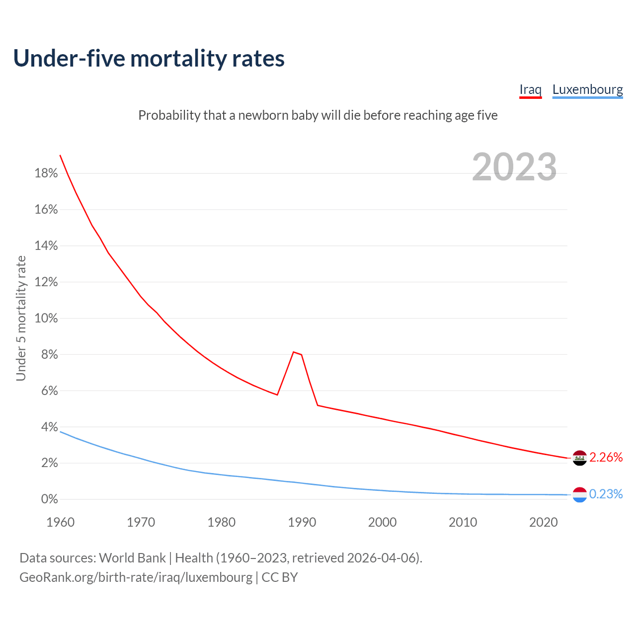 The chance that a newborn baby will die before reaching age five is 2.26% in Iraq and 0.23% in Luxembourg. Above is a chart with historical data on under-five mortality rates.