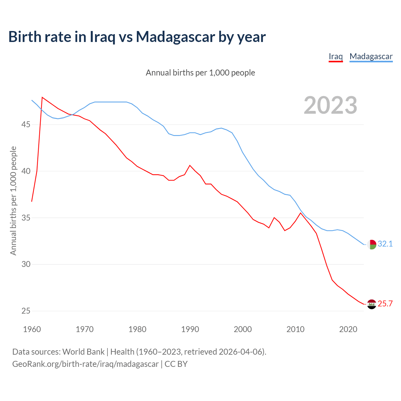 Iraq has an annual birth rate of 25.7 births per 1,000 people, compared to 32.1 for Madagascar. The average number of children a woman is expected to have during her lifetime — the fertility rate, is 3.25 in Iraq and 3.97 in Madagascar — 22.3% difference.