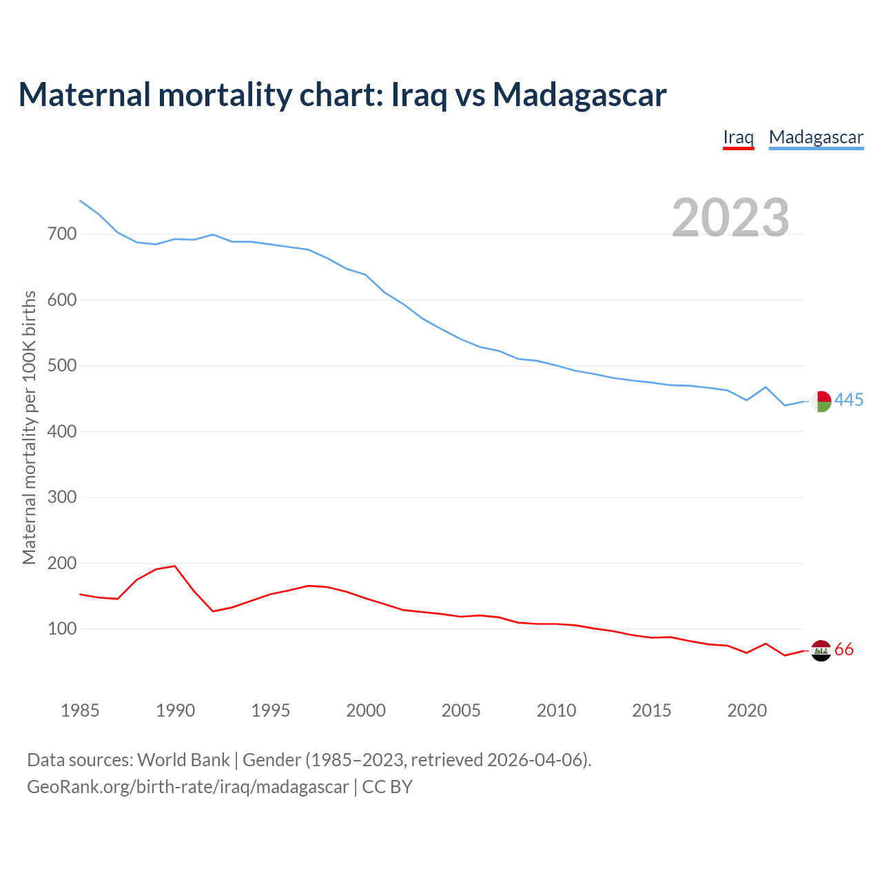 The maternal mortality rate, which is the probability of dying during childbirth or within 42 days of pregnancy termination, is 66 deaths per 100,000 live births in Iraq, compared to 445 deaths in Madagascar.