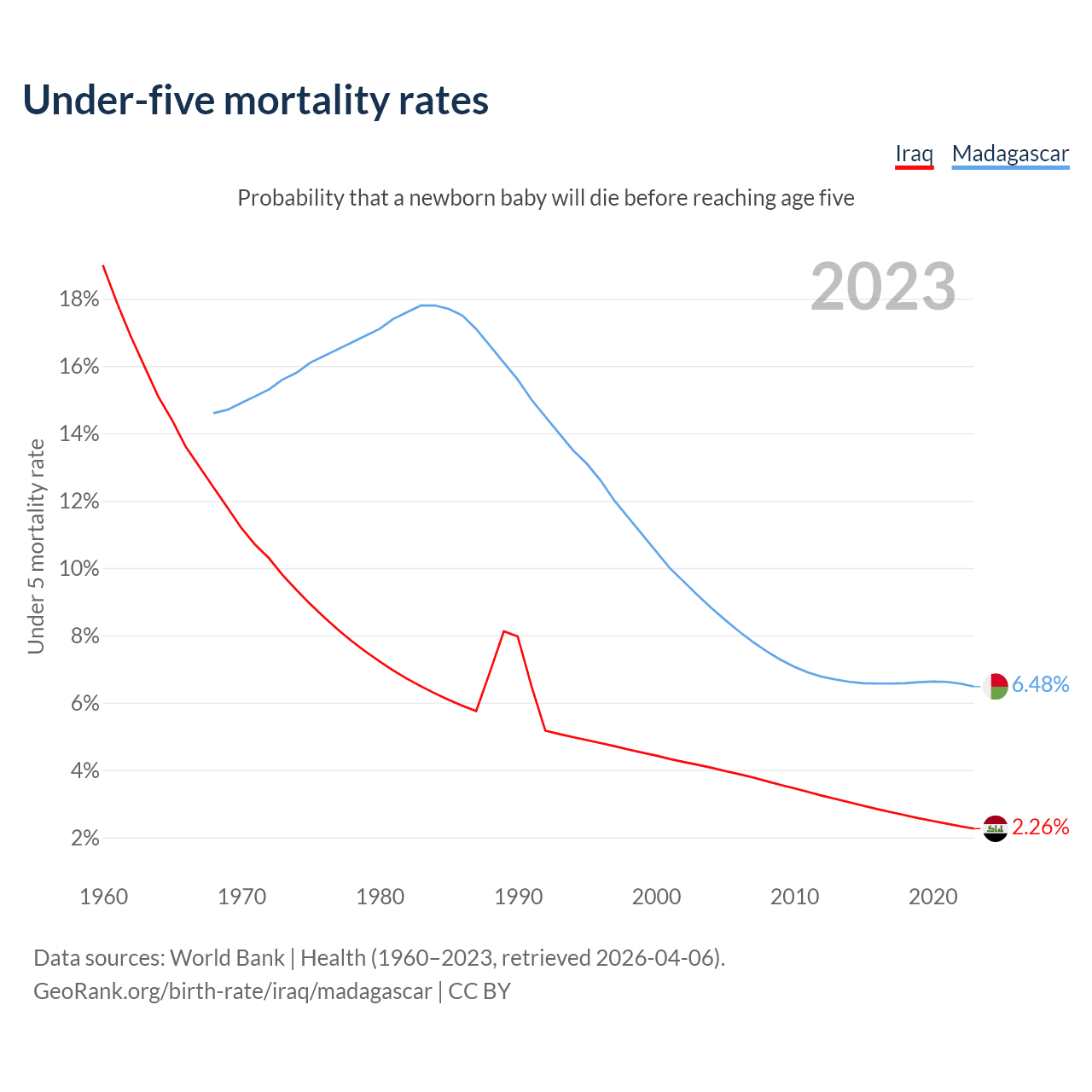 The chance that a newborn baby will die before reaching age five is 2.26% in Iraq and 6.48% in Madagascar. Above is a chart with historical data on under-five mortality rates.