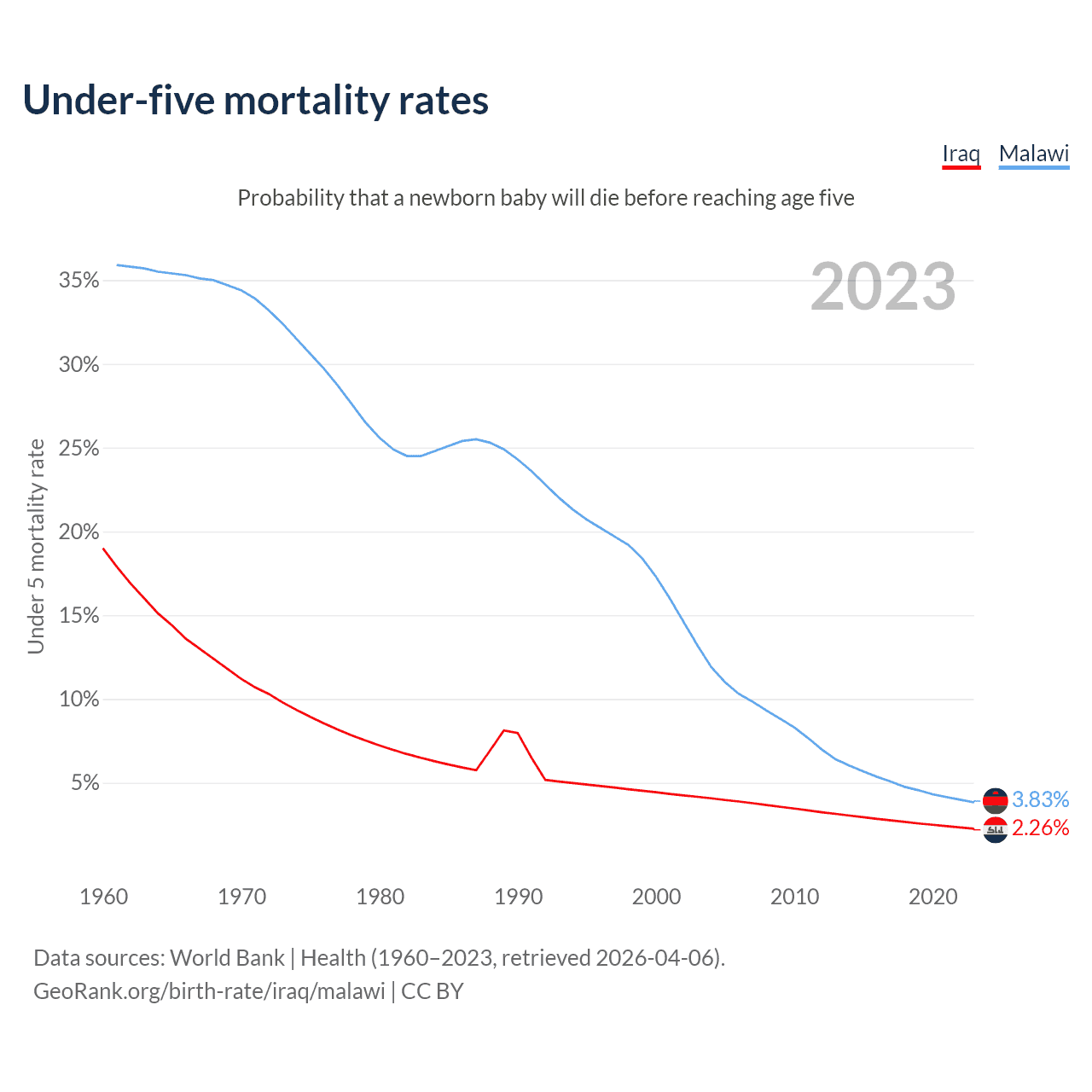 The chance that a newborn baby will die before reaching age five is 2.26% in Iraq and 3.83% in Malawi. Above is a chart with historical data on under-five mortality rates.
