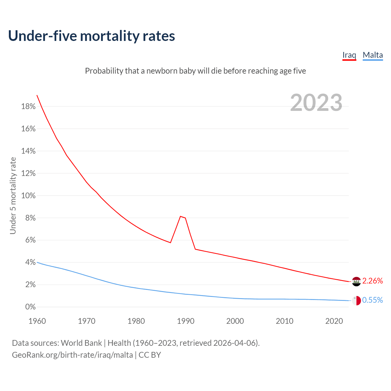 The chance that a newborn baby will die before reaching age five is 2.26% in Iraq and 0.55% in Malta. Above is a chart with historical data on under-five mortality rates.