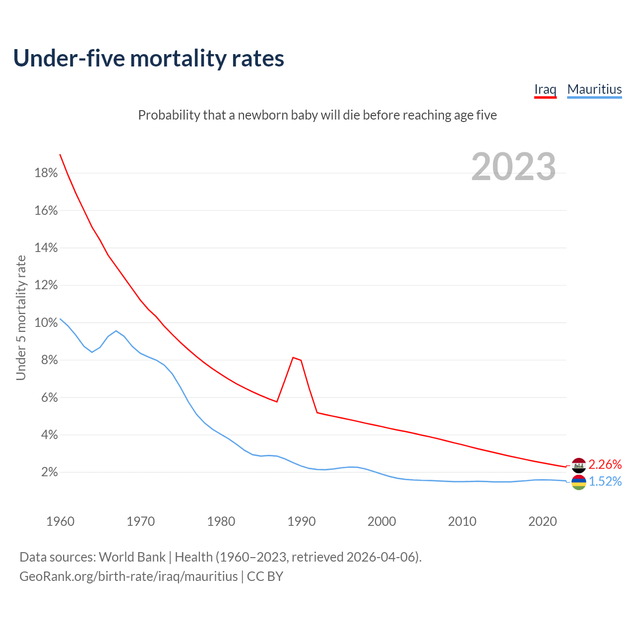 The chance that a newborn baby will die before reaching age five is 2.26% in Iraq and 1.52% in Mauritius. Above is a chart with historical data on under-five mortality rates.