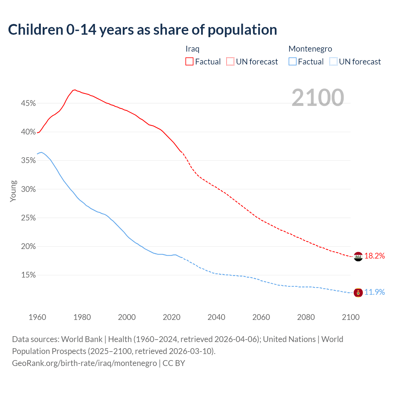 Iraq has an annual birth rate of 25.7 births per 1,000 people, compared to 11.2 for Montenegro. The average number of children a woman is expected to have during her lifetime — the fertility rate, is 3.25 in Iraq and 1.74 in Montenegro — 46.4% difference.
