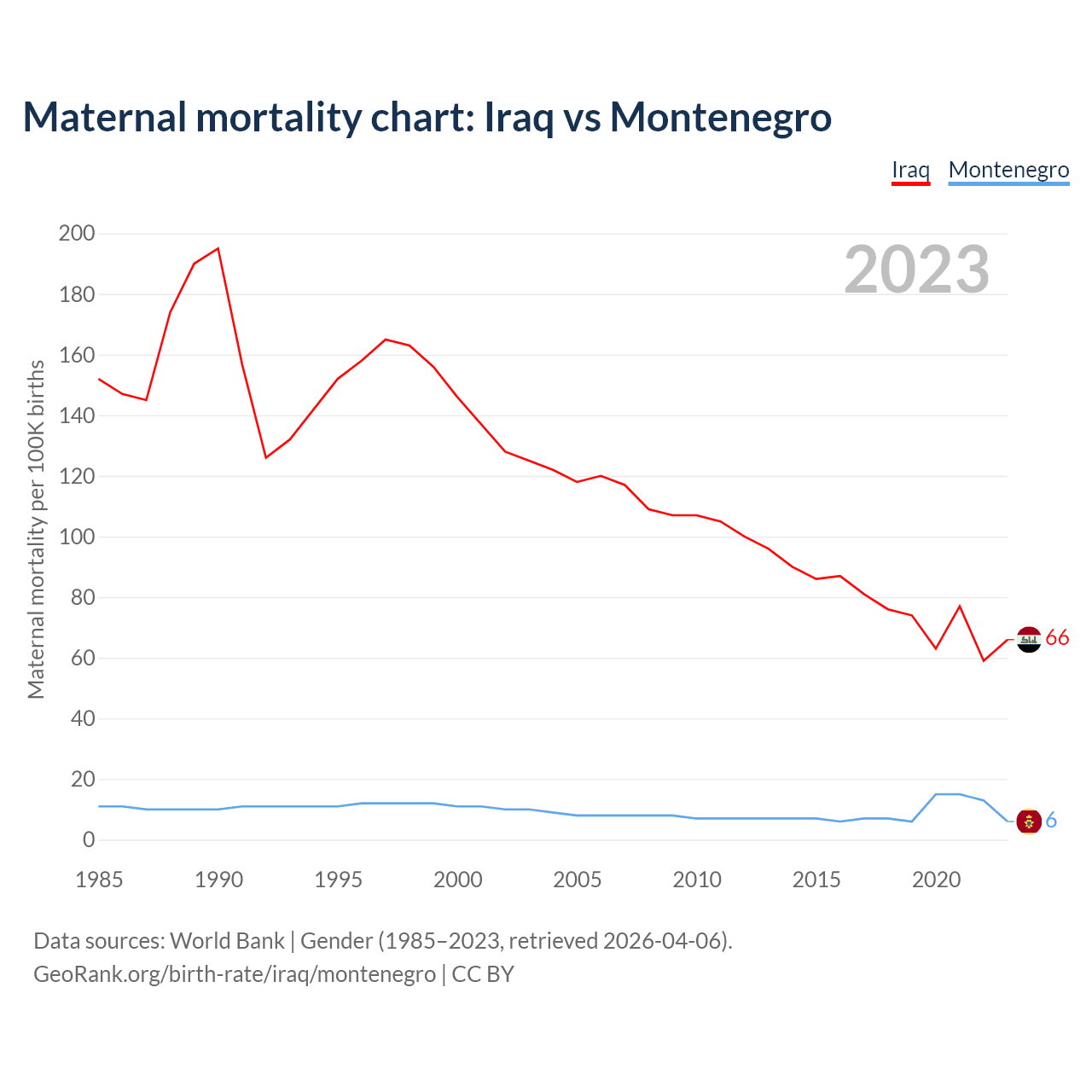 The maternal mortality rate, which is the probability of dying during childbirth or within 42 days of pregnancy termination, is 66 deaths per 100,000 live births in Iraq, compared to 6 deaths in Montenegro.