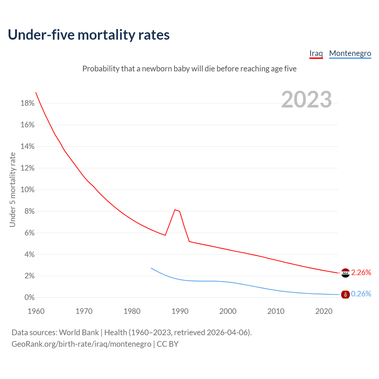 The chance that a newborn baby will die before reaching age five is 2.26% in Iraq and 0.26% in Montenegro. Above is a chart with historical data on under-five mortality rates.