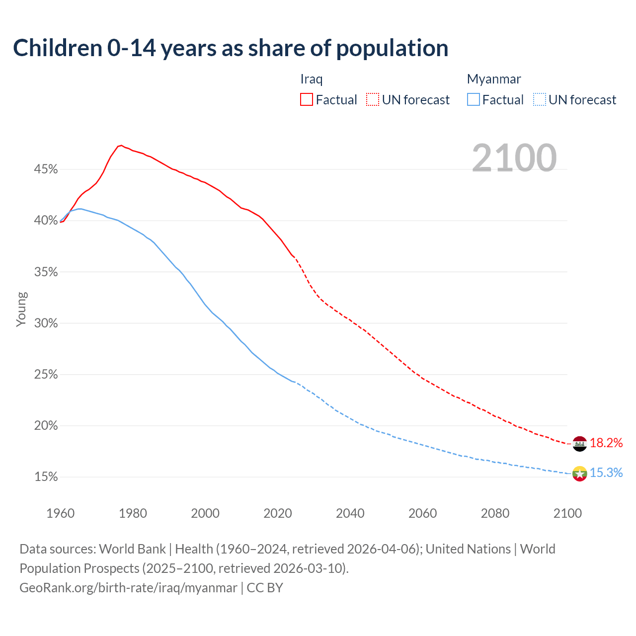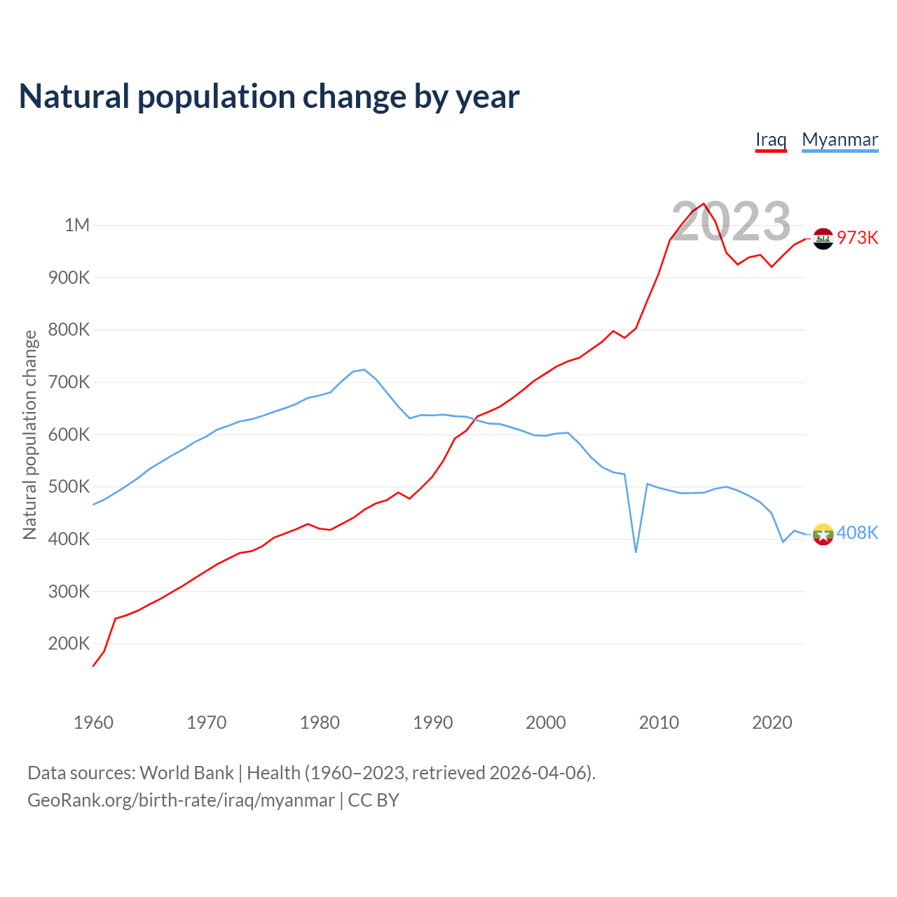 According to the latest available data on birth rates, the fertility rate in Iraq was 3.25 children per woman in 2023, compared to 2.12 in Myanmar in 2023. The replacement level is considered to be 2.1 children per woman.