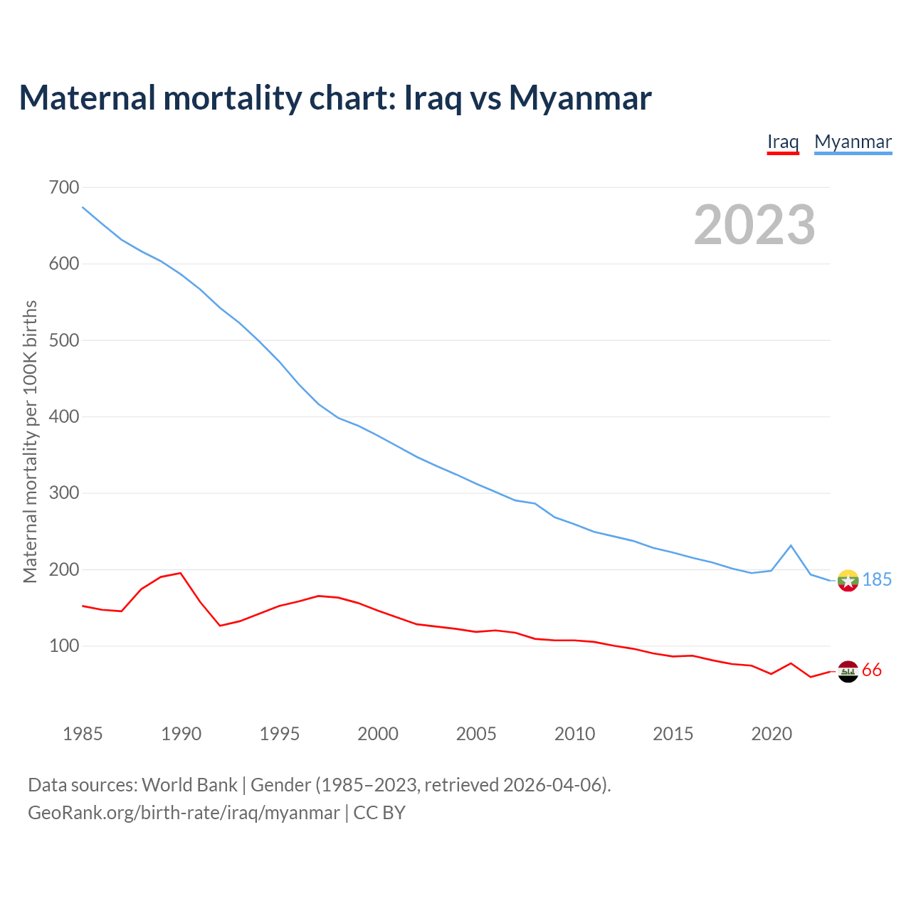 The maternal mortality rate, which is the probability of dying during childbirth or within 42 days of pregnancy termination, is 66 deaths per 100,000 live births in Iraq, compared to 185 deaths in Myanmar.