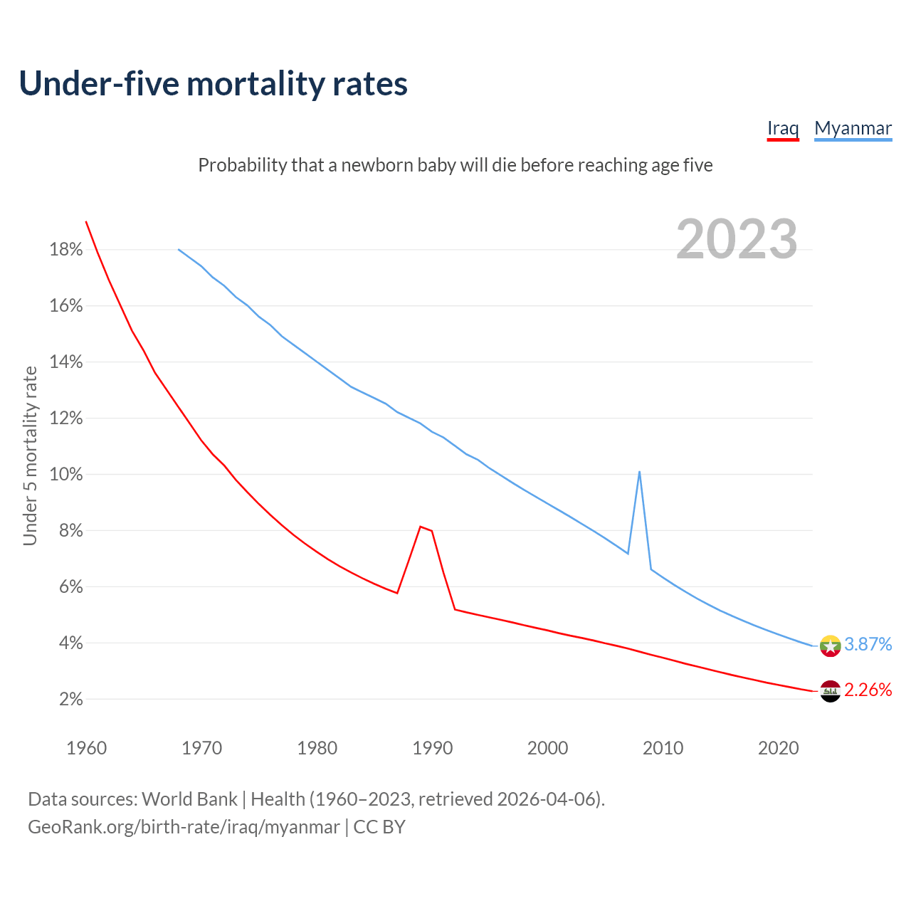 The chance that a newborn baby will die before reaching age five is 2.26% in Iraq and 3.87% in Myanmar. Above is a chart with historical data on under-five mortality rates.