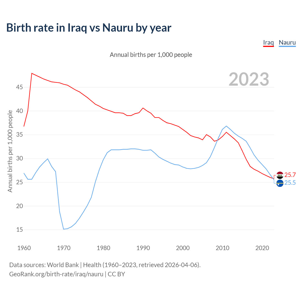 Iraq has an annual birth rate of 25.7 births per 1,000 people, compared to 25.5 for Nauru. The average number of children a woman is expected to have during her lifetime — the fertility rate, is 3.25 in Iraq and 3.33 in Nauru — 2.52% difference.