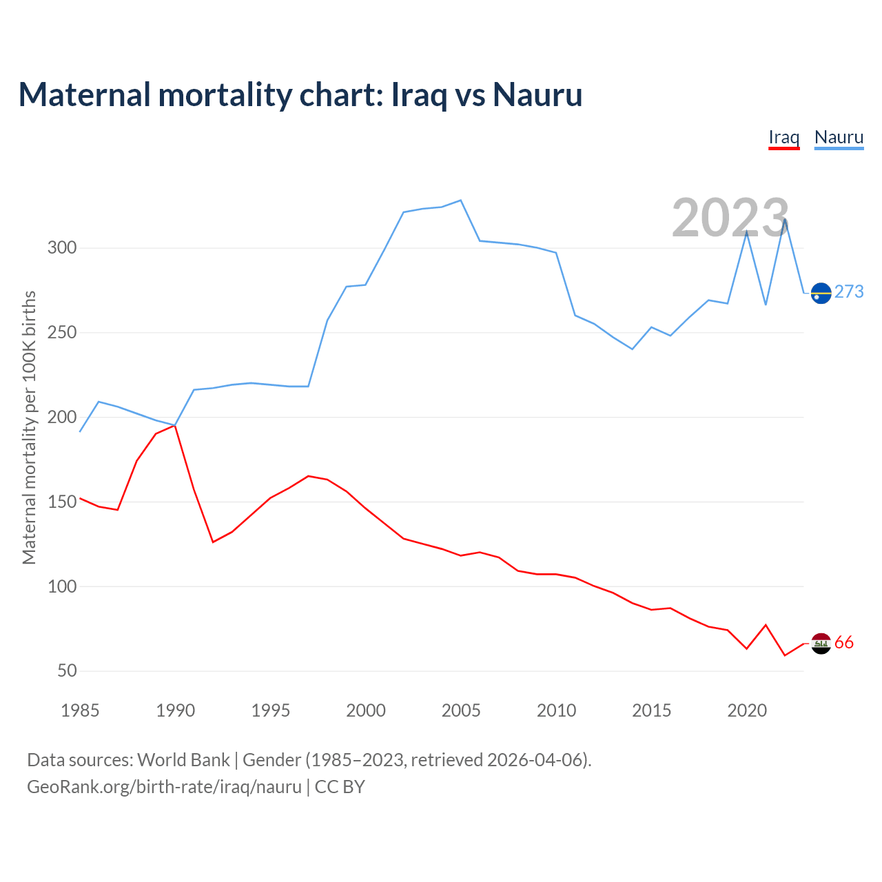 The maternal mortality rate, which is the probability of dying during childbirth or within 42 days of pregnancy termination, is 66 deaths per 100,000 live births in Iraq, compared to 273 deaths in Nauru.