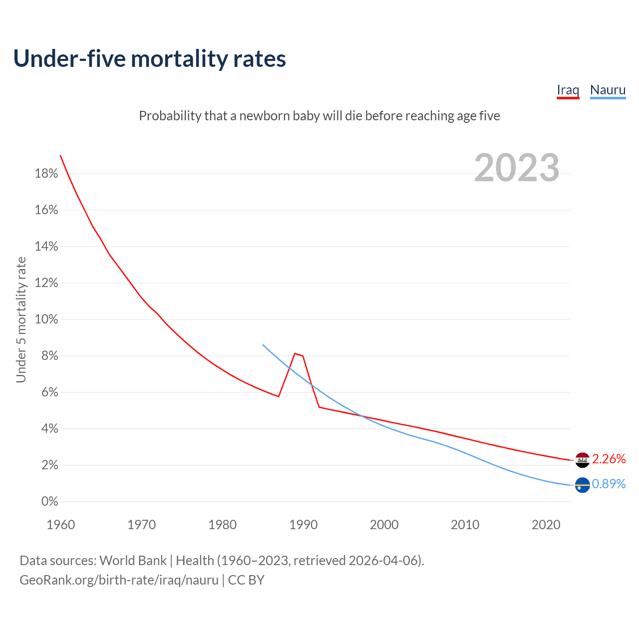The chance that a newborn baby will die before reaching age five is 2.26% in Iraq and 0.89% in Nauru. Above is a chart with historical data on under-five mortality rates.