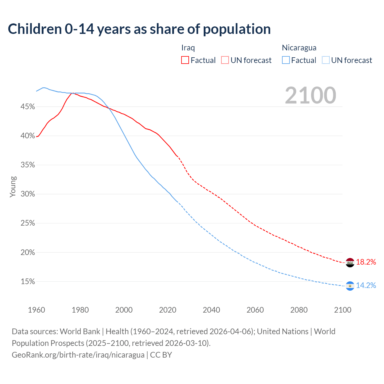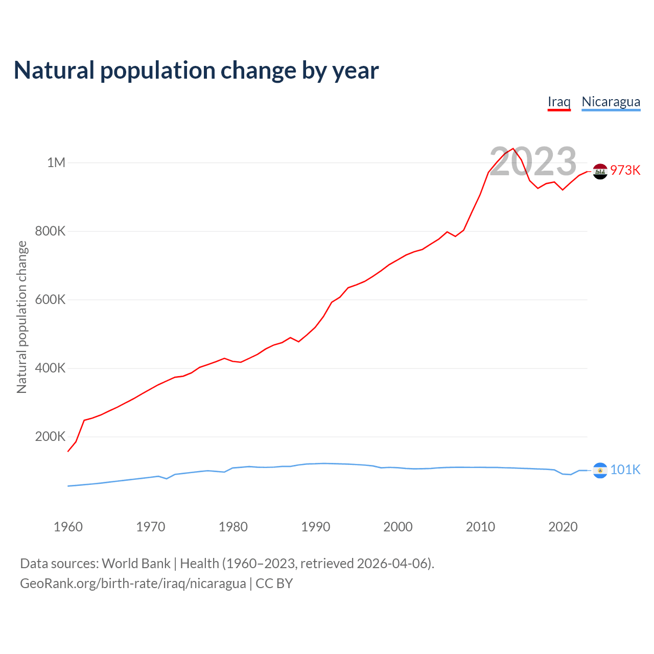 According to the latest available data on birth rates, the fertility rate in Iraq was 3.25 children per woman in 2023, compared to 2.22 in Nicaragua in 2023. The replacement level is considered to be 2.1 children per woman.