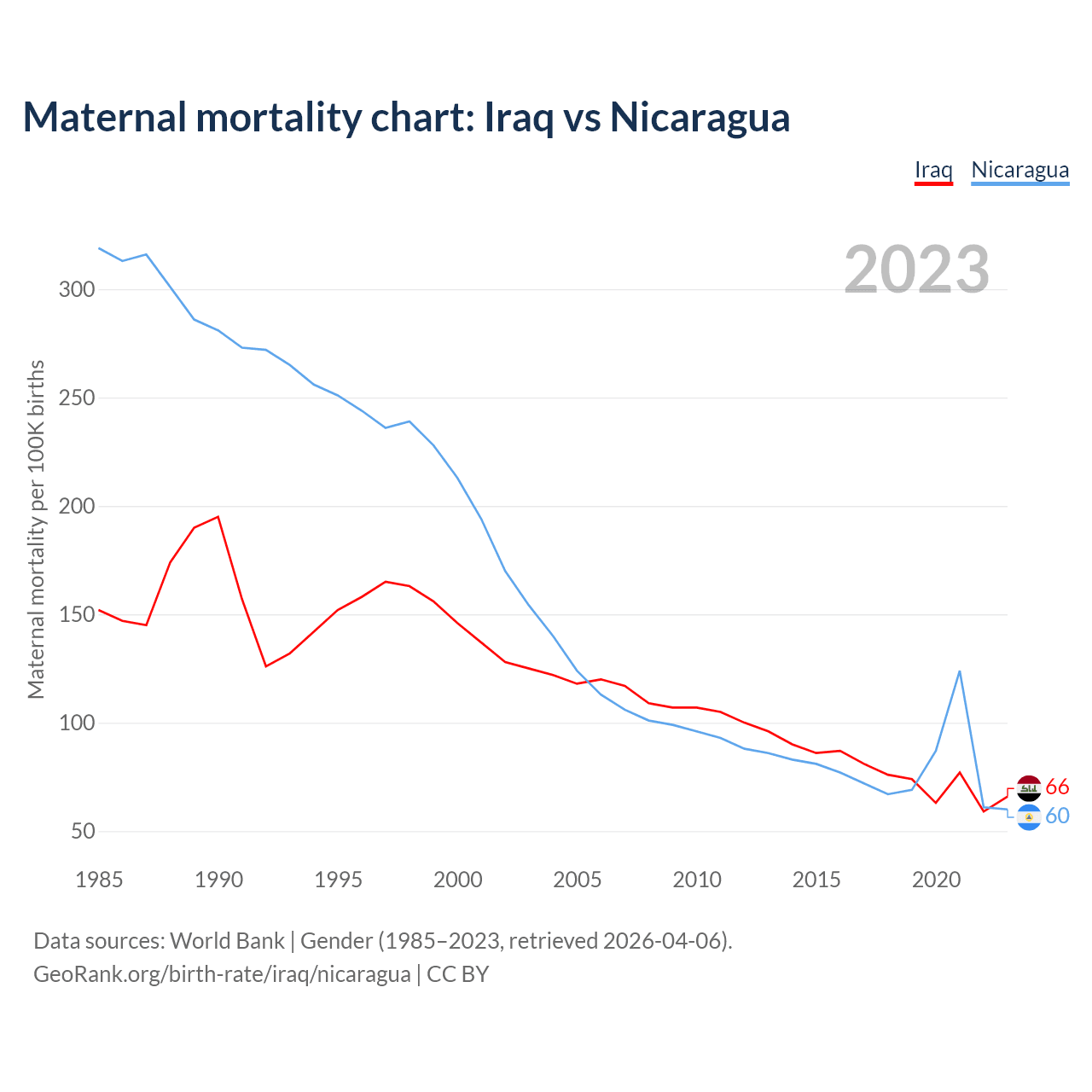 The maternal mortality rate, which is the probability of dying during childbirth or within 42 days of pregnancy termination, is 66 deaths per 100,000 live births in Iraq, compared to 60 deaths in Nicaragua.