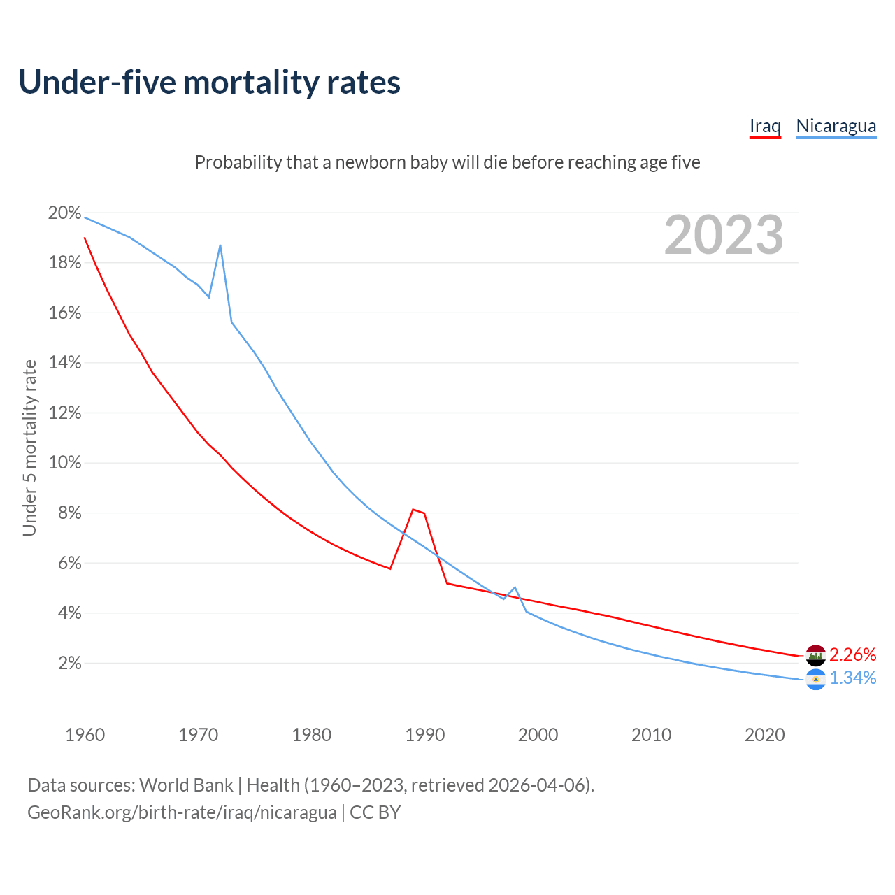 The chance that a newborn baby will die before reaching age five is 2.26% in Iraq and 1.34% in Nicaragua. Above is a chart with historical data on under-five mortality rates.