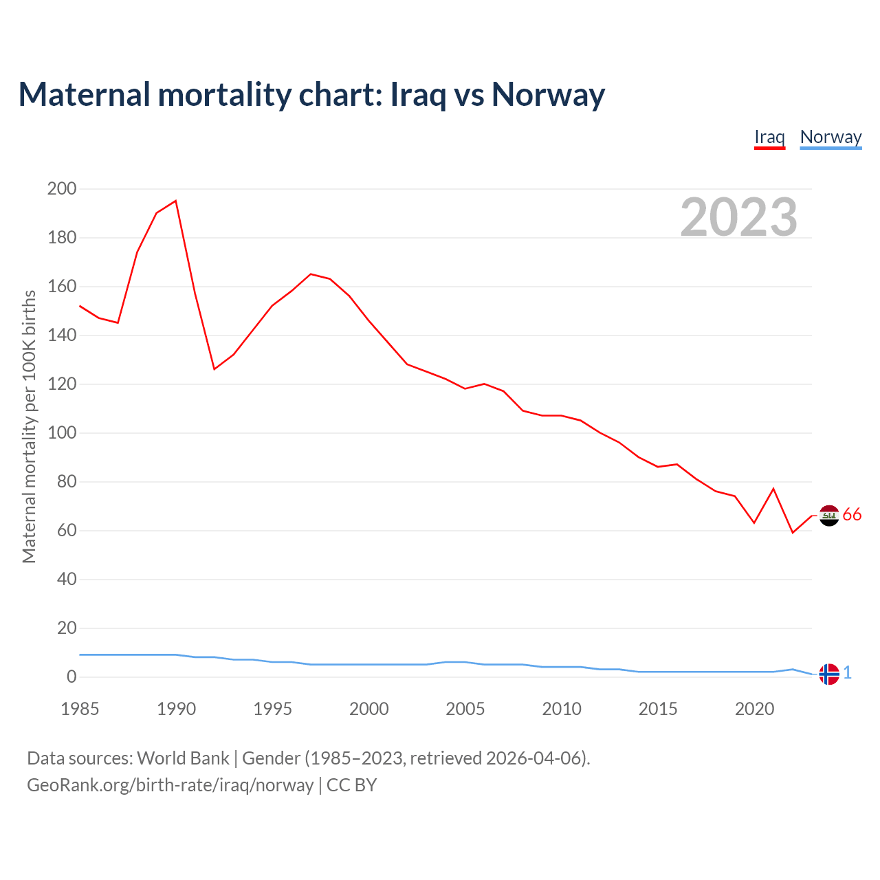 The maternal mortality rate, which is the probability of dying during childbirth or within 42 days of pregnancy termination, is 66 deaths per 100,000 live births in Iraq, compared to 1 deaths in Norway.