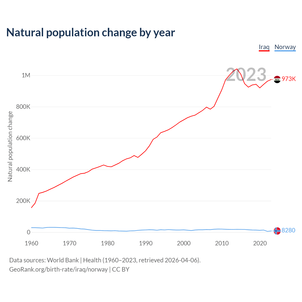 According to the latest available data on birth rates, the fertility rate in Iraq was 3.25 children per woman in 2023, compared to 1.4 in Norway in 2023. The replacement level is considered to be 2.1 children per woman.