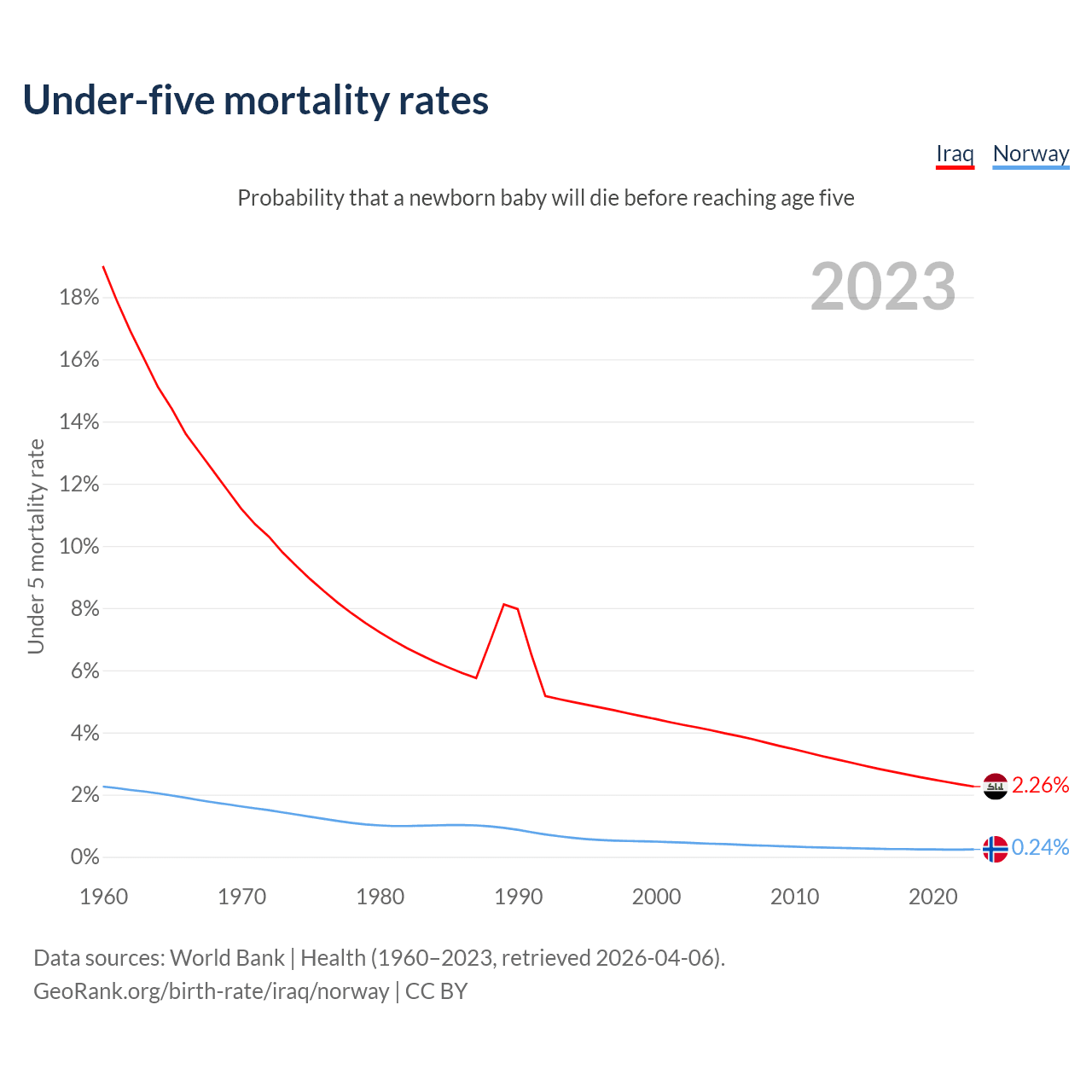 The chance that a newborn baby will die before reaching age five is 2.26% in Iraq and 0.24% in Norway. Above is a chart with historical data on under-five mortality rates.