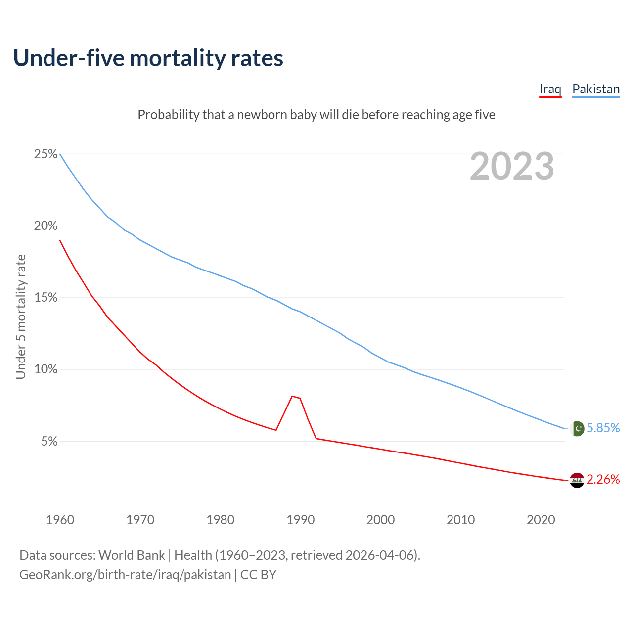 The chance that a newborn baby will die before reaching age five is 2.26% in Iraq and 5.85% in Pakistan. Above is a chart with historical data on under-five mortality rates.