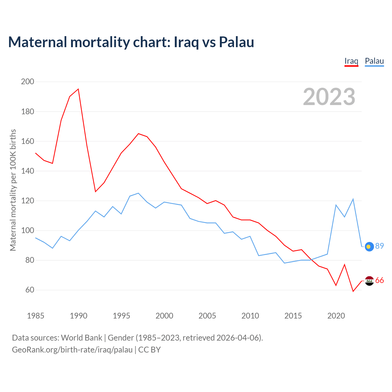 The maternal mortality rate, which is the probability of dying during childbirth or within 42 days of pregnancy termination, is 66 deaths per 100,000 live births in Iraq, compared to 89 deaths in Palau.