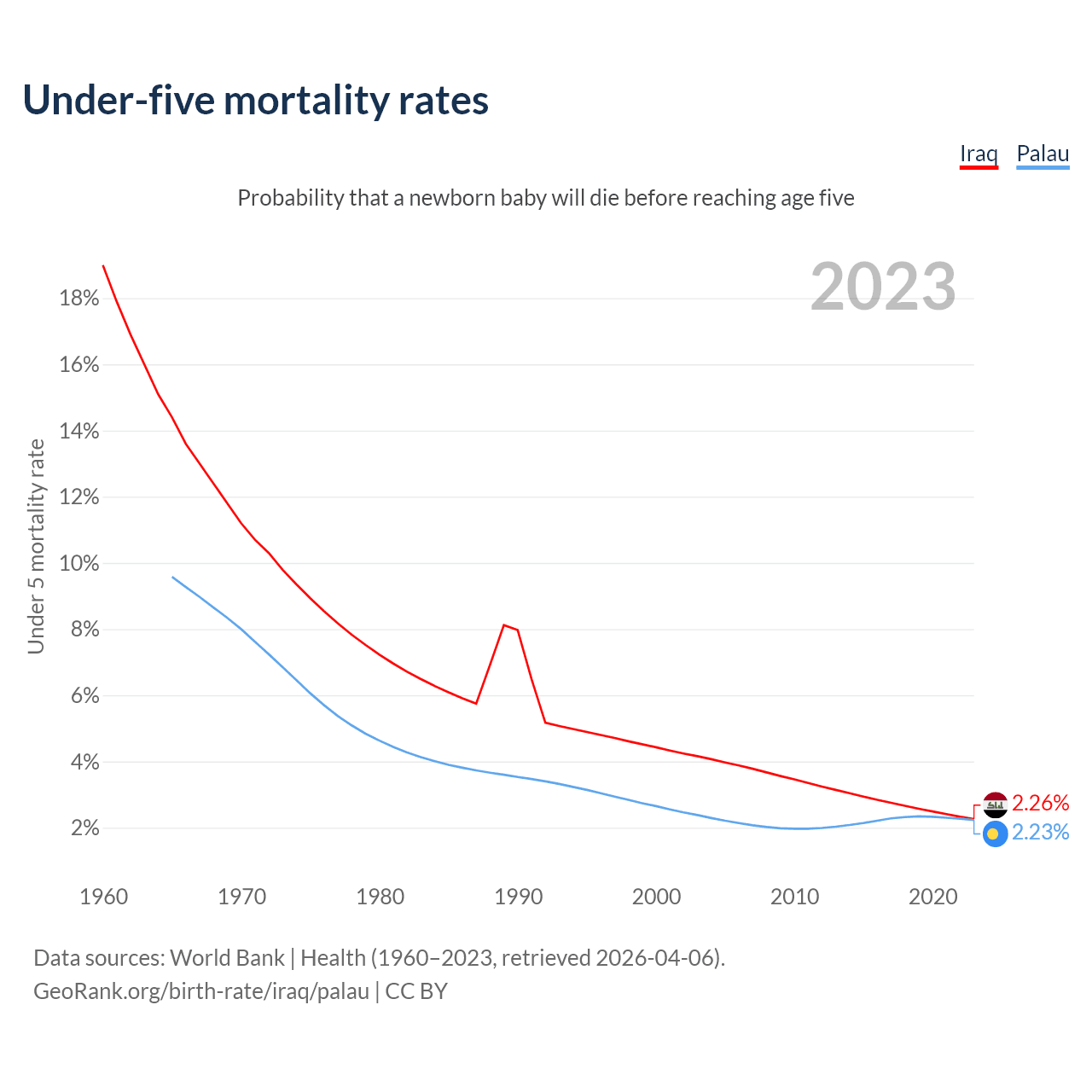 The chance that a newborn baby will die before reaching age five is 2.26% in Iraq and 2.23% in Palau. Above is a chart with historical data on under-five mortality rates.