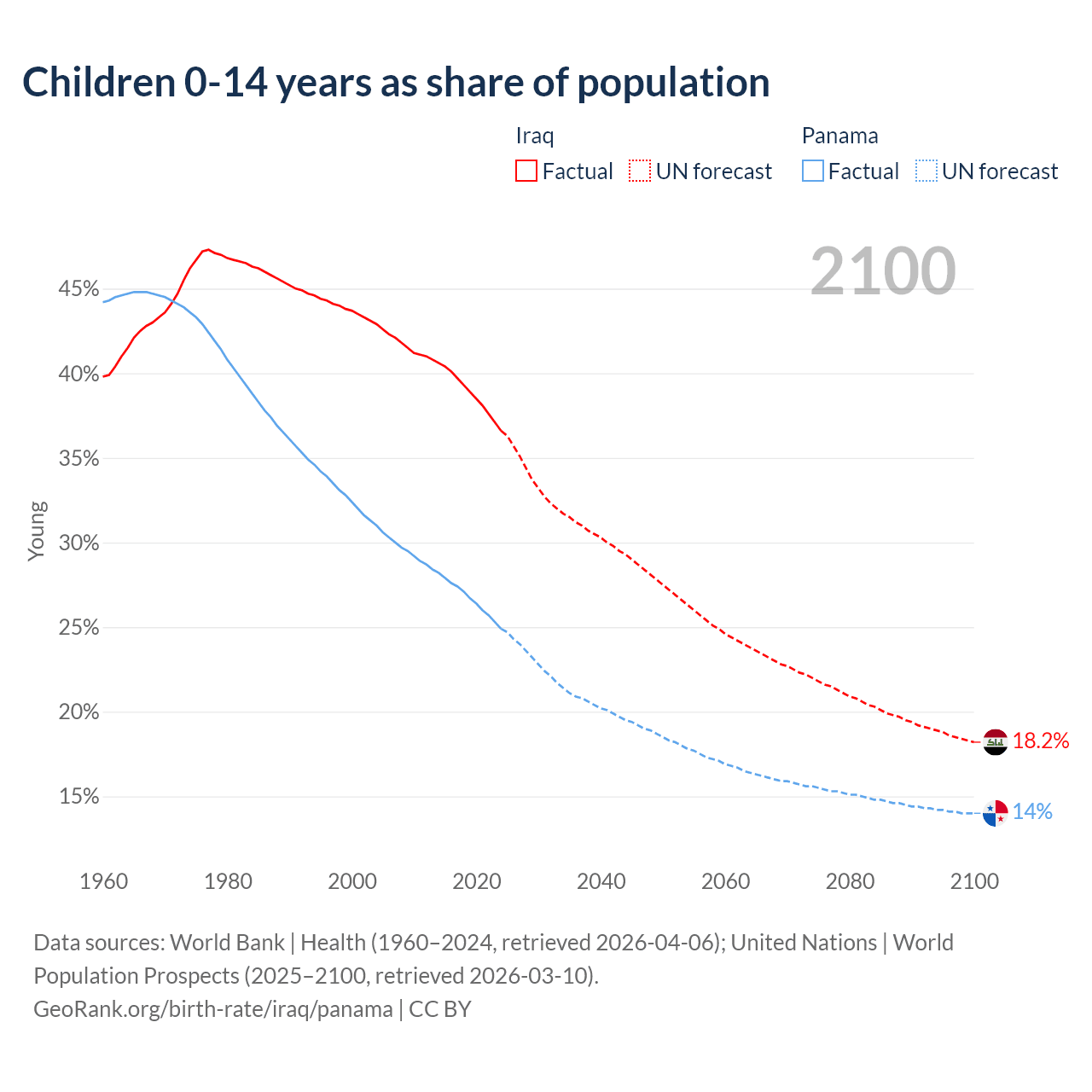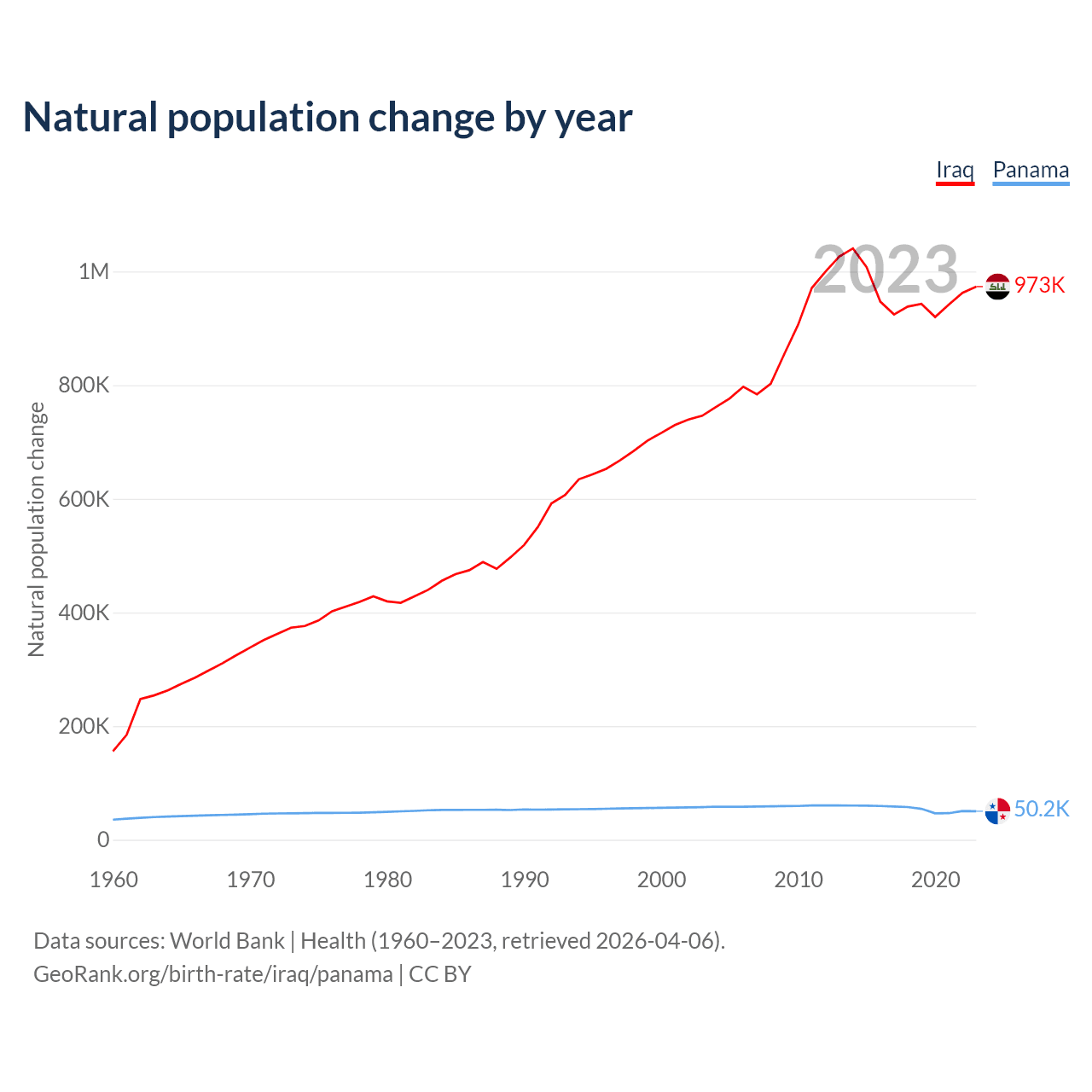 Iraq has an annual birth rate of 25.7 births per 1,000 people, compared to 16 for Panama. The average number of children a woman is expected to have during her lifetime — the fertility rate, is 3.25 in Iraq and 2.12 in Panama — 34.8% difference.