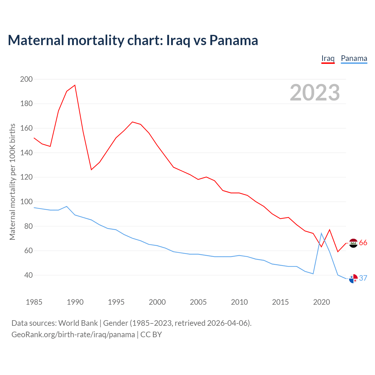 The maternal mortality rate, which is the probability of dying during childbirth or within 42 days of pregnancy termination, is 66 deaths per 100,000 live births in Iraq, compared to 37 deaths in Panama.
