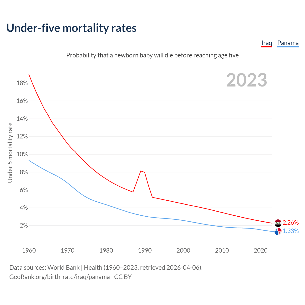 The chance that a newborn baby will die before reaching age five is 2.26% in Iraq and 1.33% in Panama. Above is a chart with historical data on under-five mortality rates.