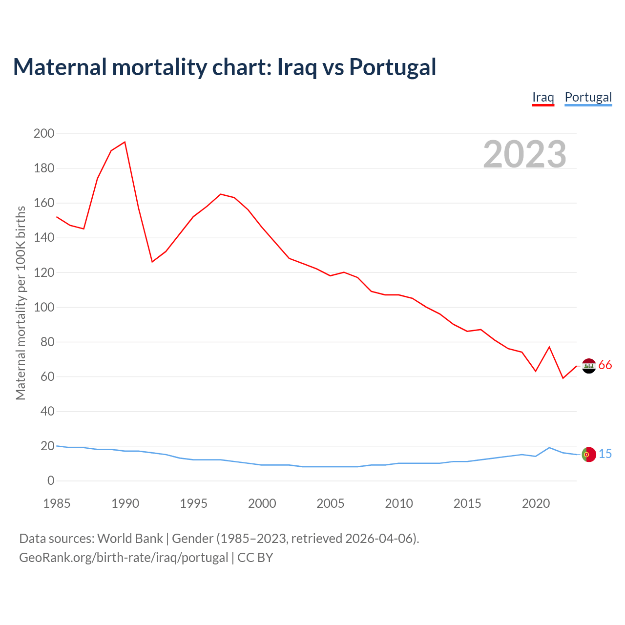 The maternal mortality rate, which is the probability of dying during childbirth or within 42 days of pregnancy termination, is 66 deaths per 100,000 live births in Iraq, compared to 15 deaths in Portugal.