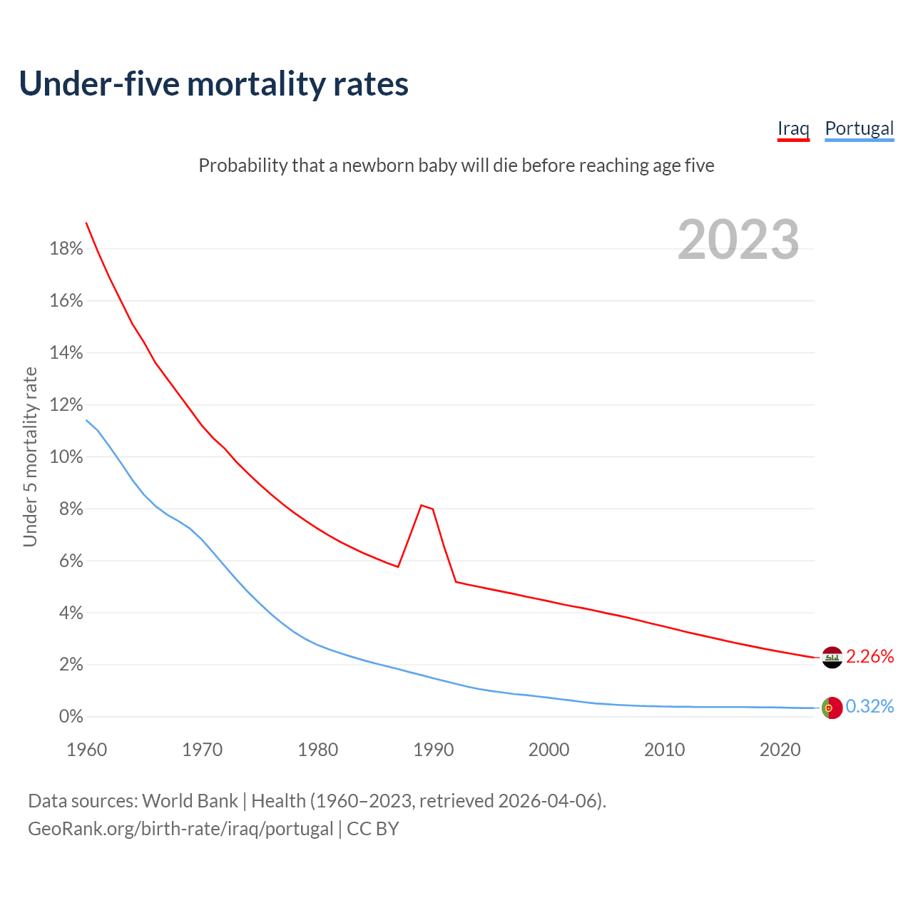 The chance that a newborn baby will die before reaching age five is 2.26% in Iraq and 0.32% in Portugal. Above is a chart with historical data on under-five mortality rates.