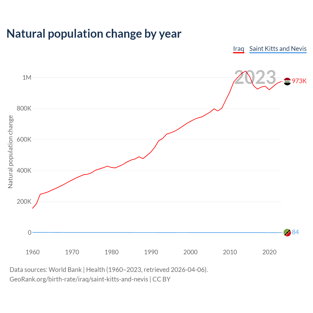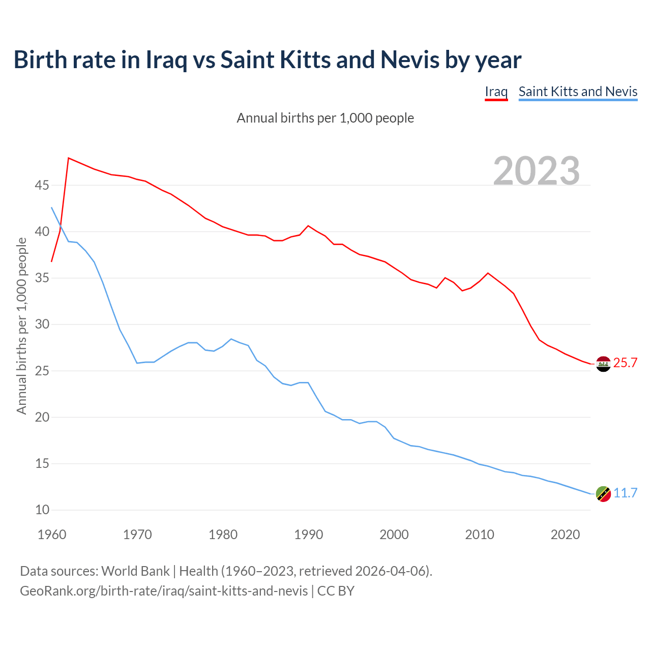 Iraq has an annual birth rate of 25.7 births per 1,000 people, compared to 11.7 for Saint Kitts and Nevis. The average number of children a woman is expected to have during her lifetime — the fertility rate, is 3.25 in Iraq and 1.51 in Saint Kitts and Nevis — 53.7% difference.