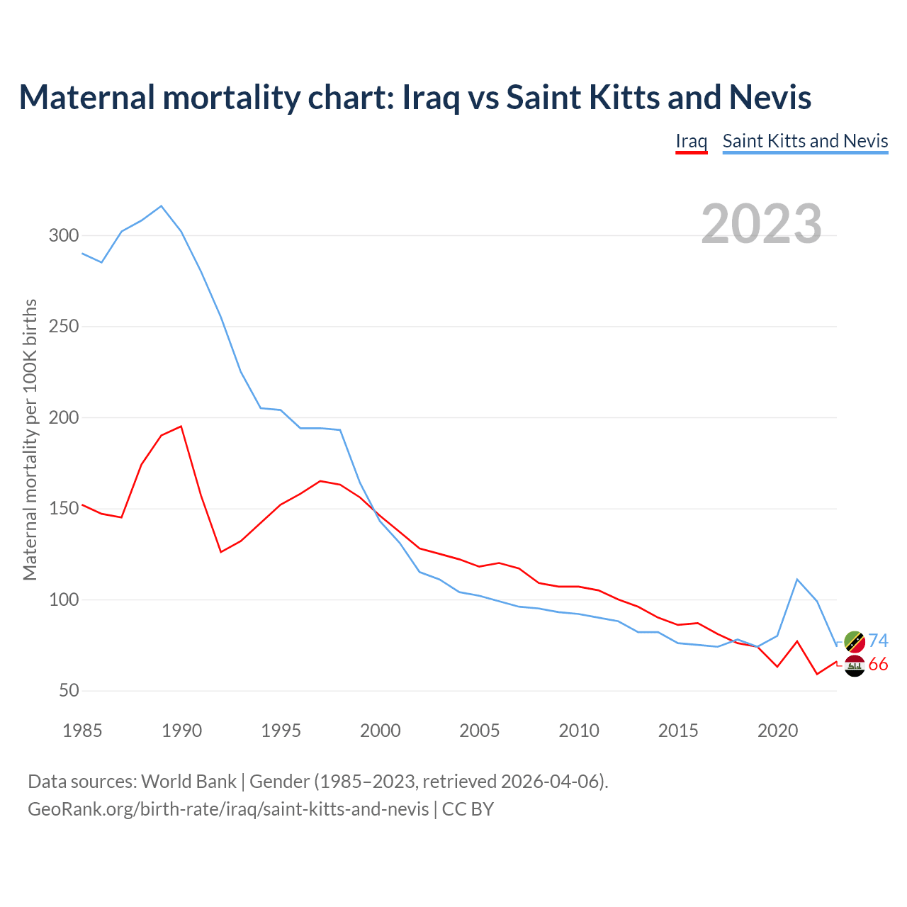 The maternal mortality rate, which is the probability of dying during childbirth or within 42 days of pregnancy termination, is 66 deaths per 100,000 live births in Iraq, compared to 74 deaths in Saint Kitts and Nevis.