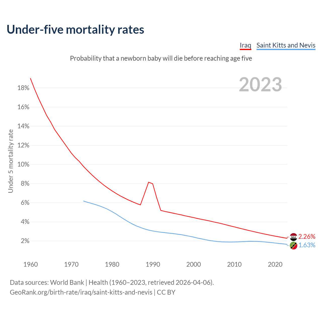 The chance that a newborn baby will die before reaching age five is 2.26% in Iraq and 1.63% in Saint Kitts and Nevis. Above is a chart with historical data on under-five mortality rates.