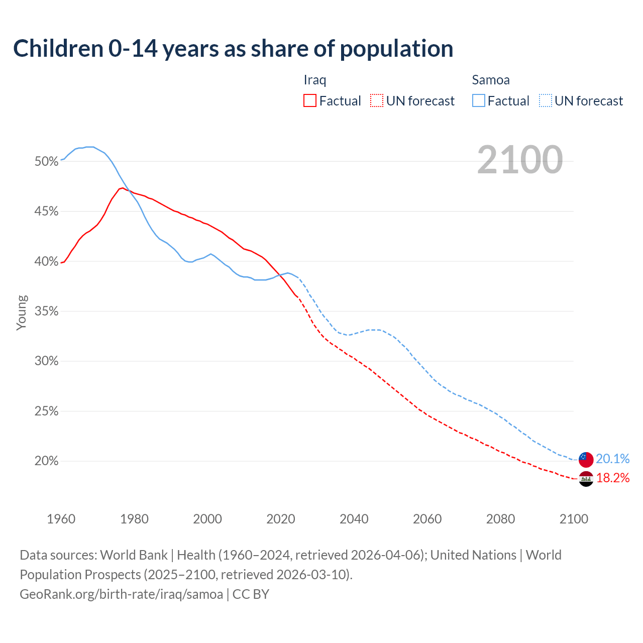 Iraq has an annual birth rate of 25.7 births per 1,000 people, compared to 25.4 for Samoa. The average number of children a woman is expected to have during her lifetime — the fertility rate, is 3.25 in Iraq and 3.83 in Samoa — 17.9% difference.