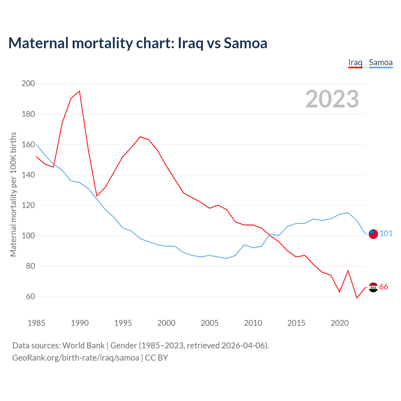 The maternal mortality rate, which is the probability of dying during childbirth or within 42 days of pregnancy termination, is 66 deaths per 100,000 live births in Iraq, compared to 101 deaths in Samoa.