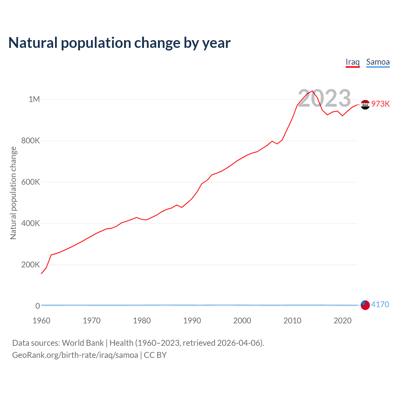 According to the latest available data on birth rates, the fertility rate in Iraq was 3.25 children per woman in 2023, compared to 3.83 in Samoa in 2023. The replacement level is considered to be 2.1 children per woman.