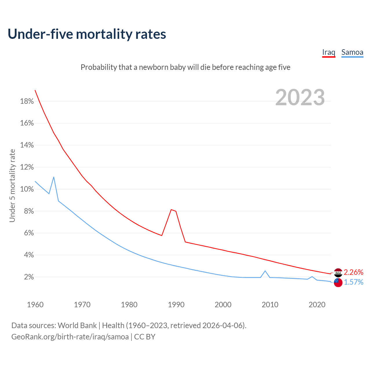The chance that a newborn baby will die before reaching age five is 2.26% in Iraq and 1.57% in Samoa. Above is a chart with historical data on under-five mortality rates.